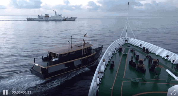 中国海警公布的两段视频显示,中方舰船依法依规拦阻管控菲方侵权挑衅船只,菲方船只以危险方式接近中方船只导致擦碰。