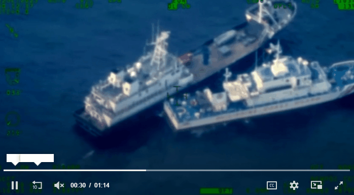 菲律宾军方提供的画面,BBC配文(上图)声称左侧中方“民兵”船只(实为中国渔船)“碰撞”菲海警船,而视频(下图)却显示菲海警船有预谋主动倒车,尾部与中国停车漂泊的琼三沙渔00003船右舷发生擦碰。