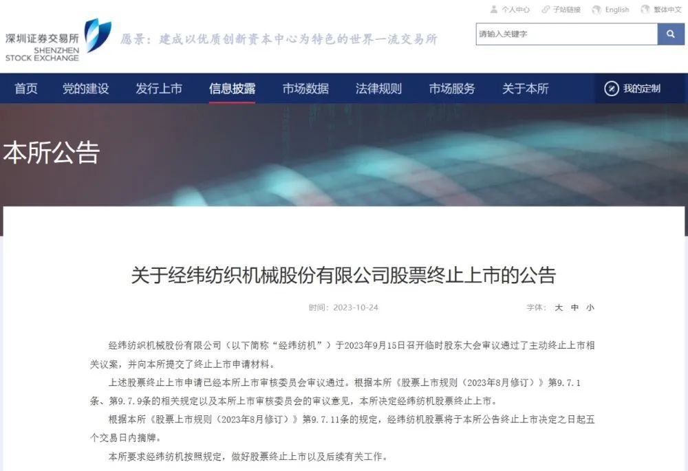 经纬纺机主动终止上市靴子落地,深交所正式决定公司股票终止上市。